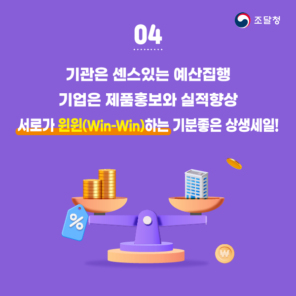 ◆ 국가기관인 조달청에서 운영하는 쇼핑몰로서, 경기침체로 어려운 중소기업을 지원하고 기관은 할인제품을 구매해 국가예산을 아낄 수 있는 곳입니다. 기관은 좀더 효과적인 예산을 집행할 수 있고 기업은 제품홍보 및 실적향상을 기대할 수 있는 서로 윈윈(Win-Win) 하자는 취지 입니다.
