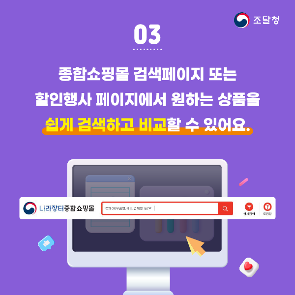 ◆ 나라장터 종합쇼핑몰에서는 상생세일 이외에도 다양한 이벤트가 마련되어 있으니, 개인 이나 1인기업, 중소기업에서도 필요한 제품들을 확인하시어 좀 더 경쟁력있는 가격으로 우수한 제품을 가져가시길 바랍니다.